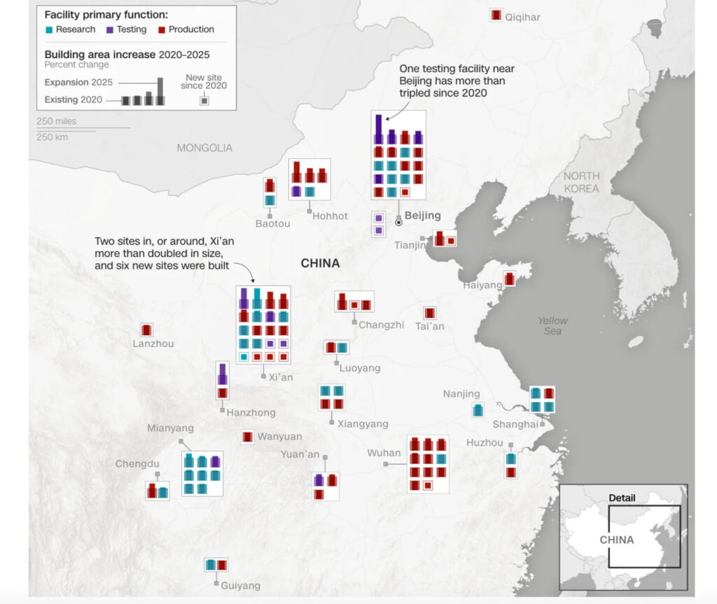 Новий аналіз супутникових знімків, карт та урядових повідомлень виявив величезне зростання виробничих потужностей Китаю, пов’язаних із виробництвом ракет, починаючи з 2020 року. Це історичне нарощування різко контрастує з проблемами постачання військової техніки у самих Сполучених Штатах.