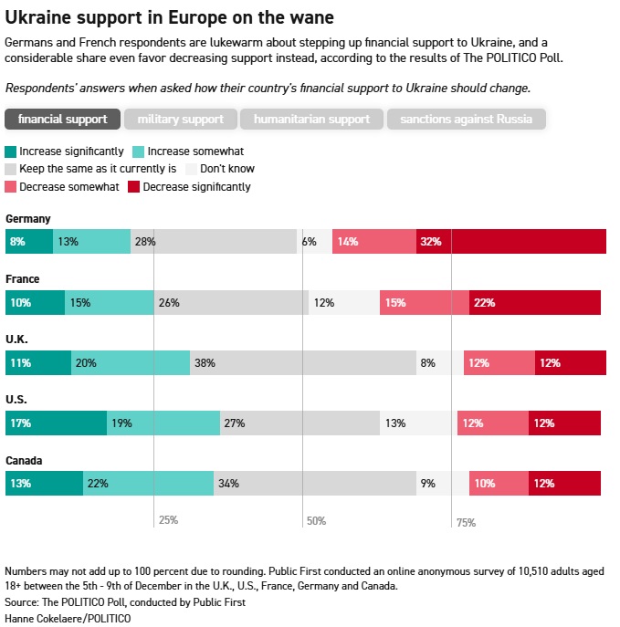 У двох найбільших економіках Європейського Союзу більшість респондентів тепер виступають за те, щоб їхні уряди зменшили фінансову підтримку Києва. Найбільш скептично налаштовані громадяни Німеччини: 45 відсотків опитаних вимагають скорочення допомоги, і лише 20 відсотків підтримують її збільшення. У Франції ситуація схожа — 37 відсотків респондентів хочуть давати менше, тоді як 24 відсотки висловлюються за нарощування фінансування.